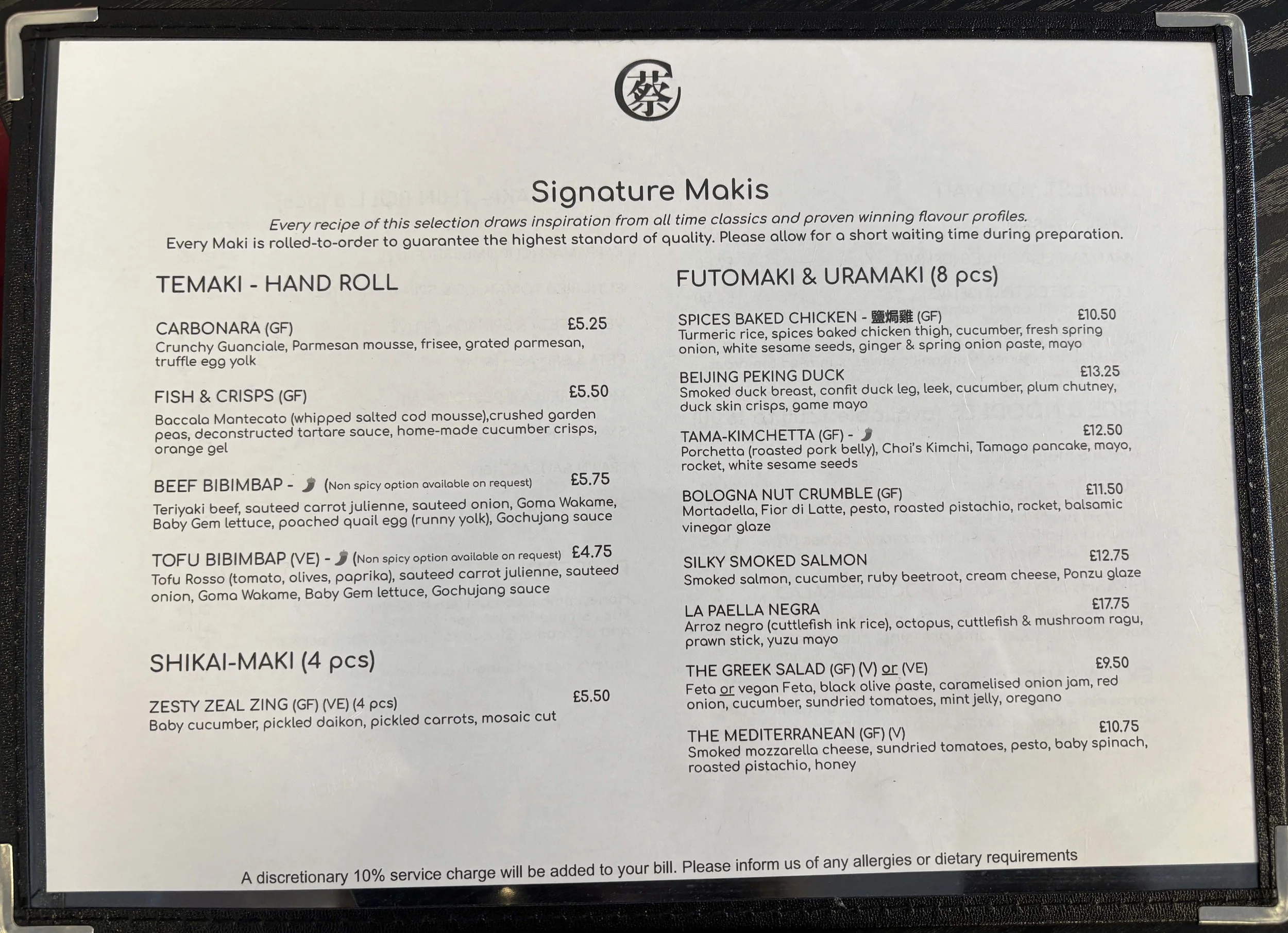 First up: the Temaki Carbonara (above). This hand roll is a revelation – creamy parmesan mousse, crunchy guanciale, a truffle-cured egg yolk and shaved parmesan, all rolled with finesse. It’s rich, indulgent and entirely original – Italian comfort food reimagined as a sushi roll. At just £5.25, it’s also incredible value.