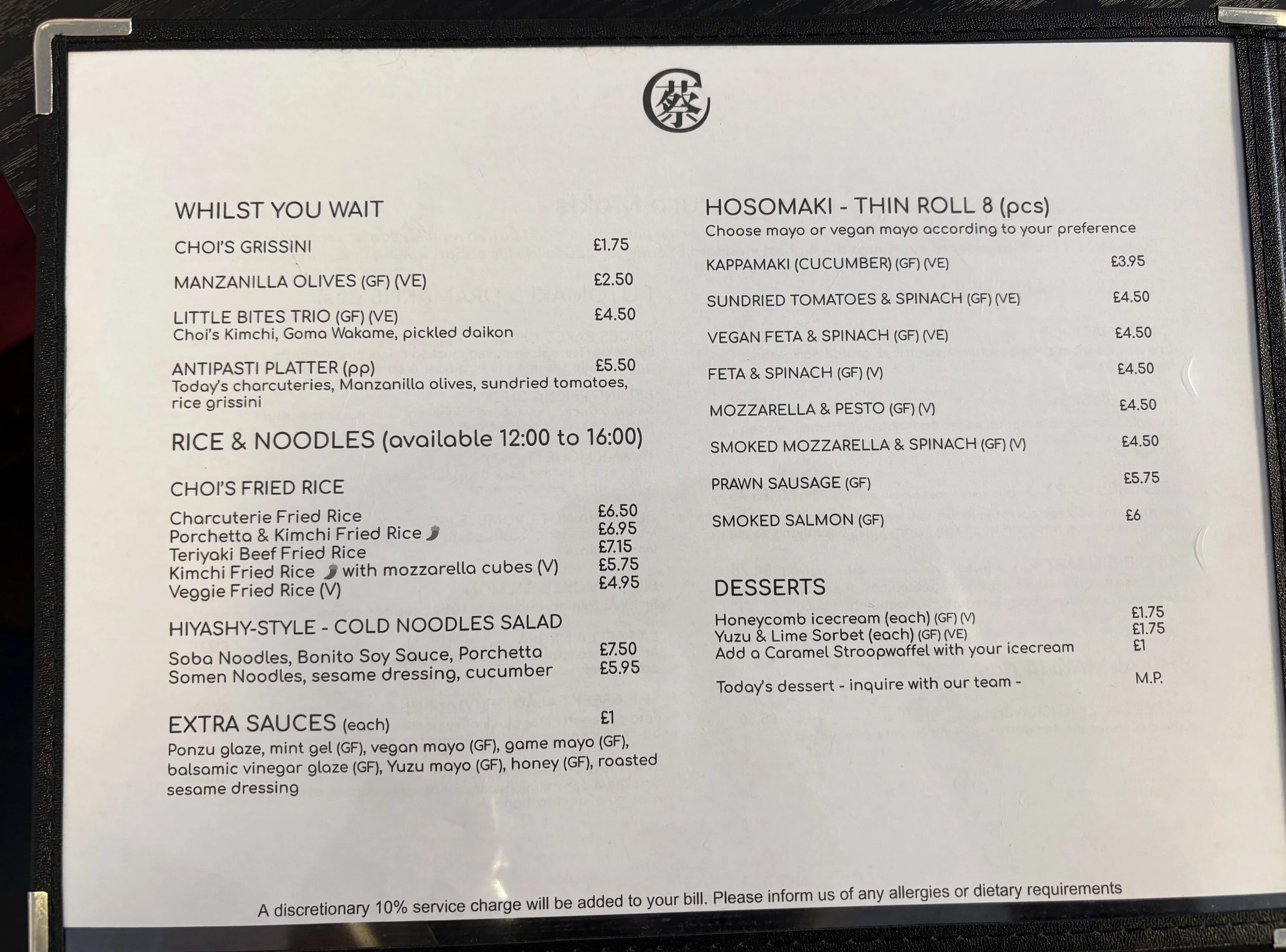 Choi’s is fully licensed, offering a carefully chosen selection of sparkling wines, whites, reds and rosés, alongside beers, traditional sake, fragrant yuzu liqueur and rich, plummy umeshu. Thanks to their strong supplier connections, the wine list is regularly refreshed, so there’s always something new to discover in your glass!
