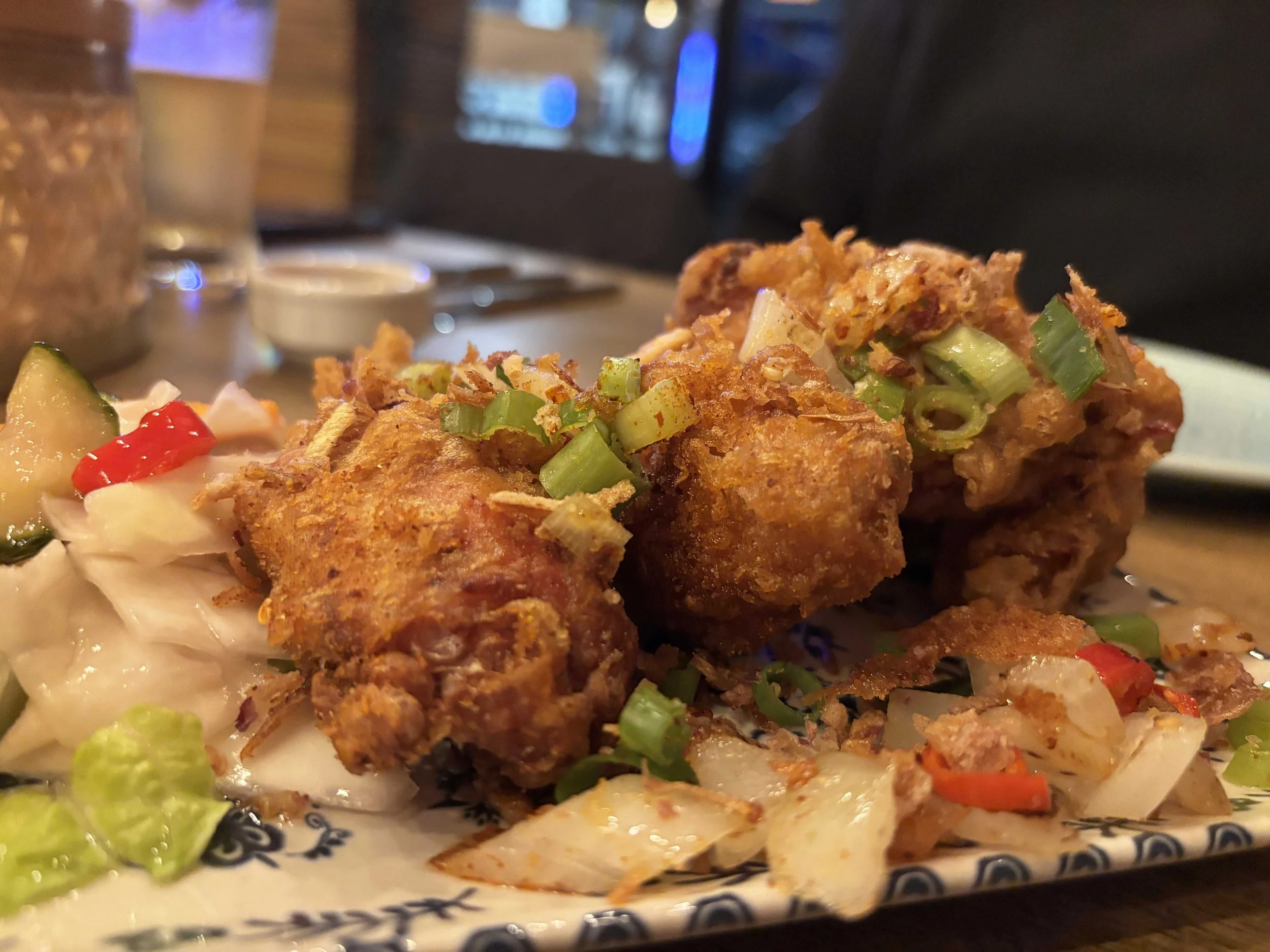 We started with prawn crackers for the table, because honestly, is it a Thai meal without them? Then came the salt and pepper chicken wings, an immediate highlight: a good portion for sharing, crisp-skinned and moreish, tossed through with chilli, onion, aromatic salt and a smoky edge of paprika. I could have ordered another plate of them.