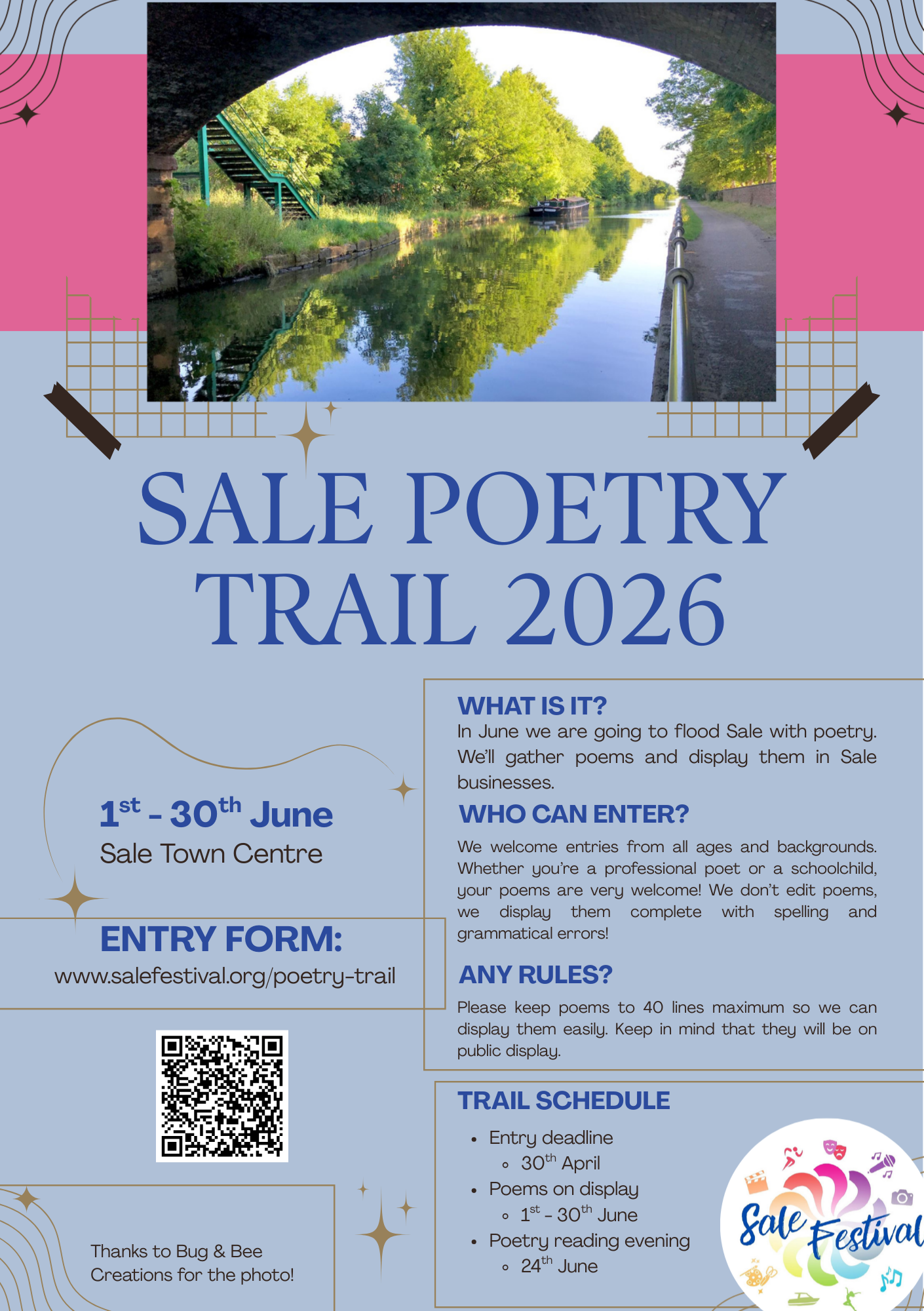 The deadline to enter is 30 April 2026. Selected poems will then go on display in Sale town centre from 01-30 June 2026, with a poetry reading evening on 24 June as part of the festival celebrations.