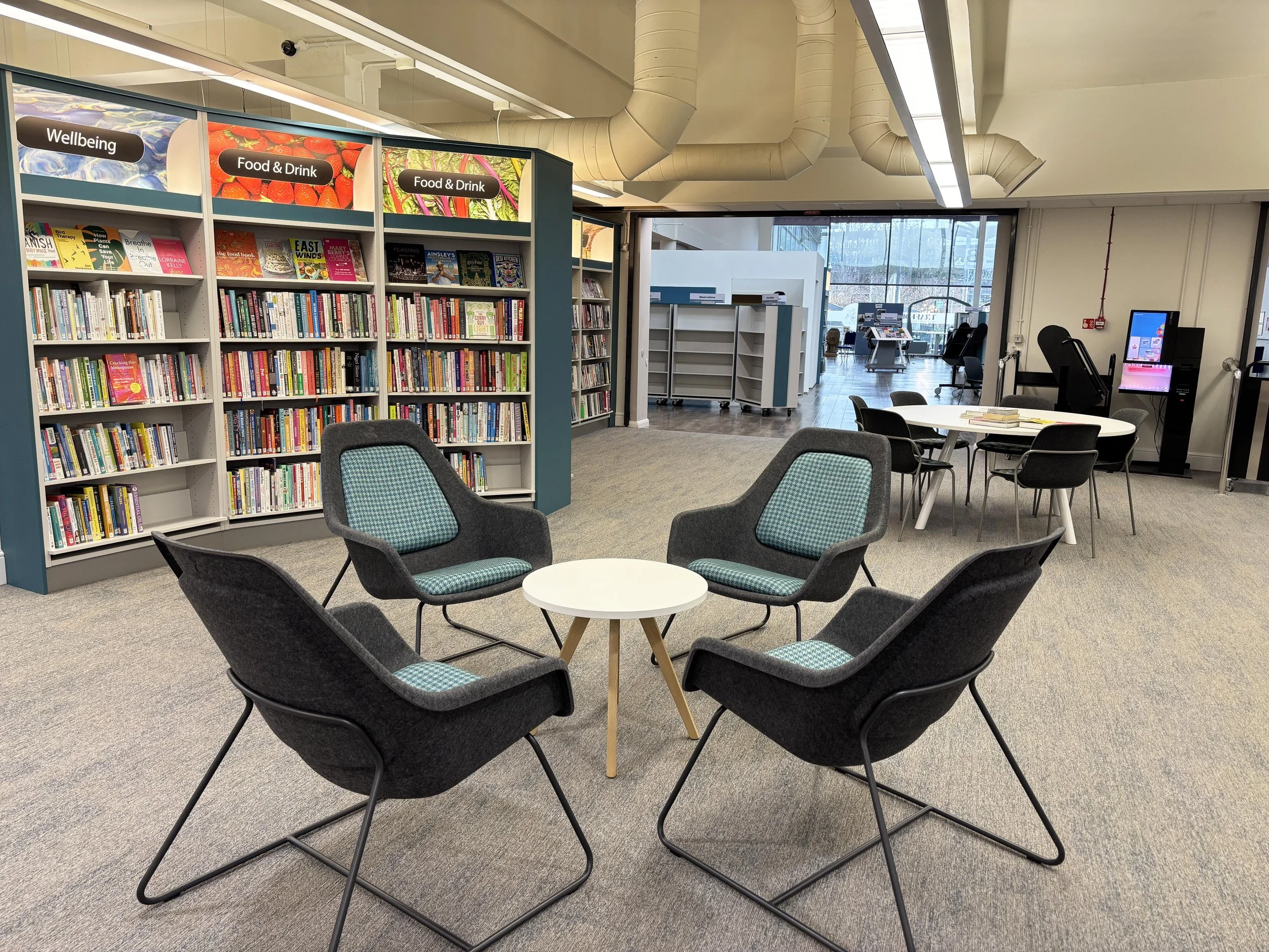 The project, funded by Arts Council England, has completely refreshed both the library and the foyer area at Sale Waterside. Visitors will notice the difference as soon as they walk in – the space is brighter, more open and far more comfortable to spend time in, with new furniture and a layout designed to make browsing and relaxing feel easy rather than cramped.